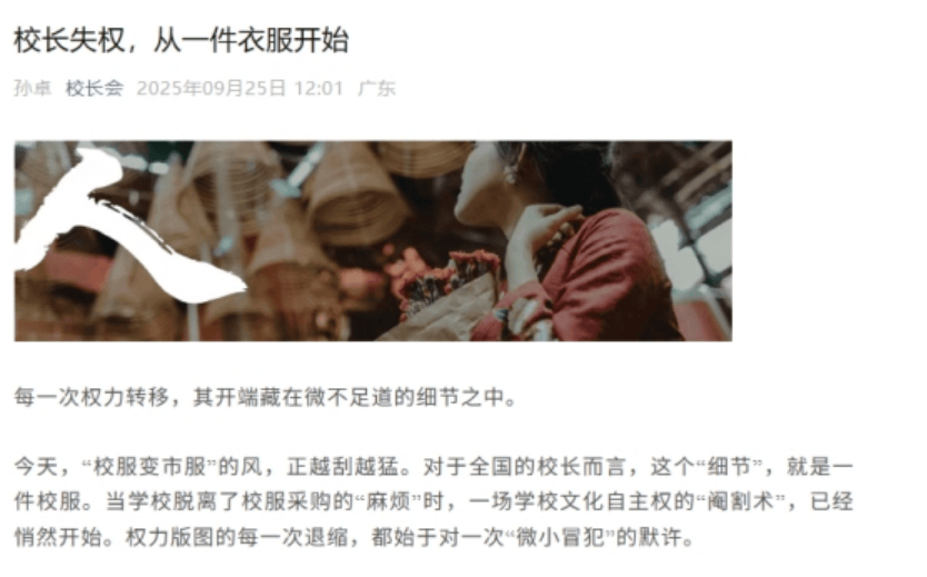 对于学校来说,校服是优雅的校徽、精神图腾、文化遗产的传承。学校几十年甚至上百年所积累的校风、校训、历史底蕴,都凝聚成独特的条纹、色彩、图案。这是母校学生的身份呃还有校友识别码。是建设校园文化的一个重要组成部分。但“市政服务”模式粗暴地剥夺了学校的文化表达权,强行“格式化”了数百所历史和理念不同的学校,将各类教育机构沦为标准化、可互换、没有灵魂的生产线。 。当校服讲述的不再是“我们学校”的故事,而是“我们城市”的代号时,母校独特的印记就被无情抹去了。